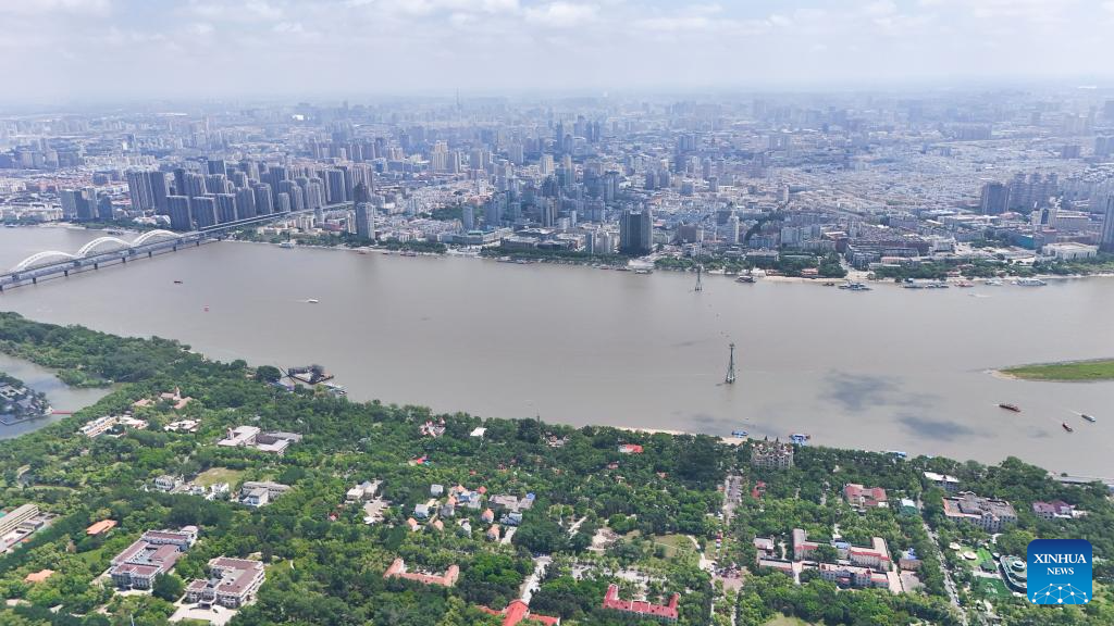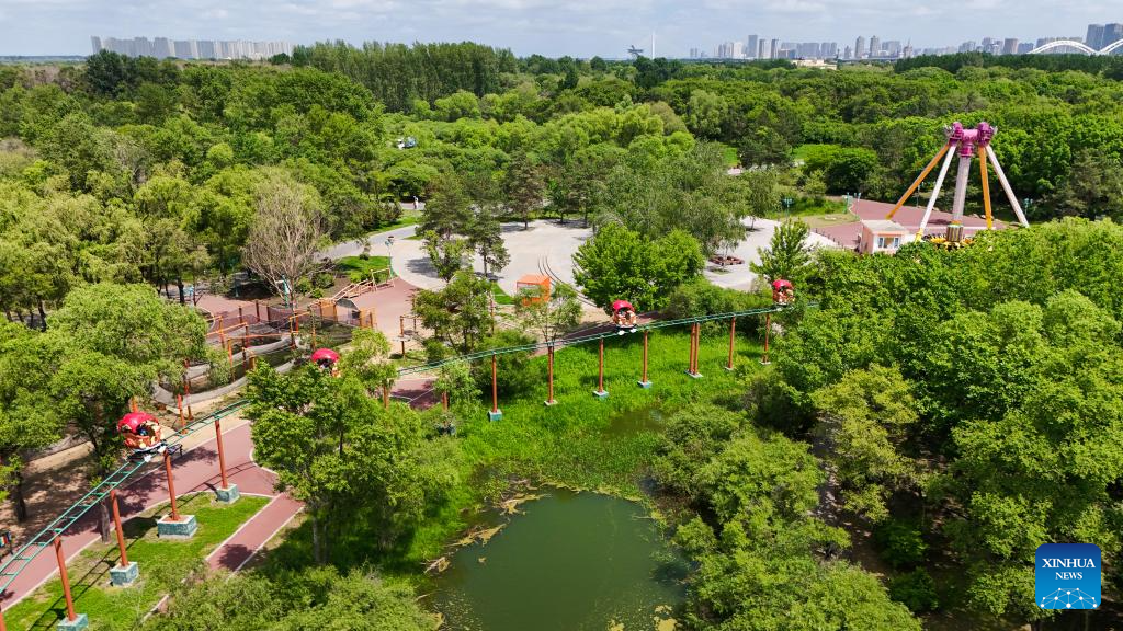 An aerial drone photo taken on June 4, 2024 shows a view of Heilongjiang Taiyangdao National Wetland Park and city view in Harbin, northeast China's Heilongjiang Province. (Xinhua/Wang Song)