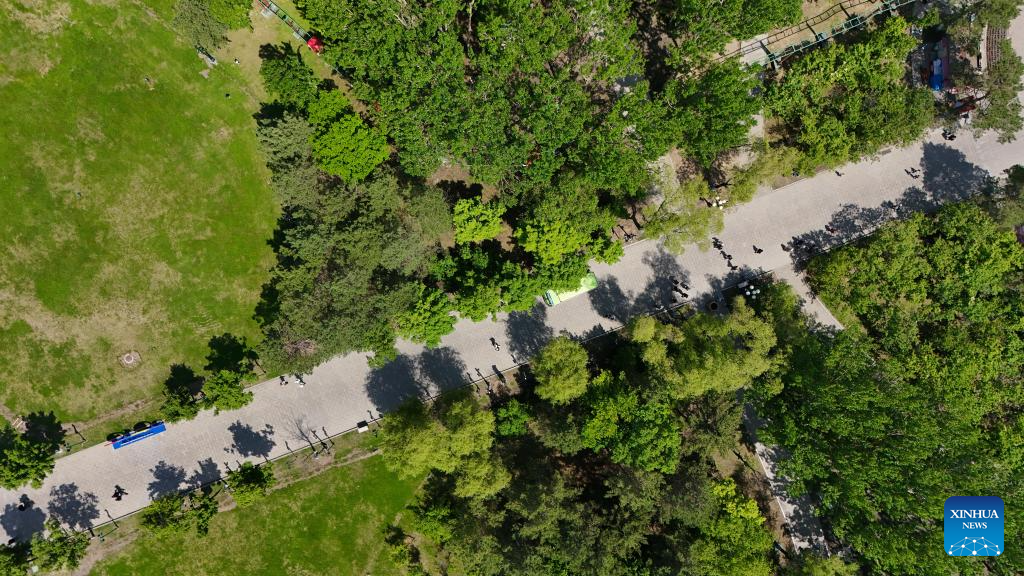 An aerial drone photo taken on June 4, 2024 shows people visiting Heilongjiang Taiyangdao National Wetland Park in Harbin, northeast China's Heilongjiang Province. (Xinhua/Wang Song)