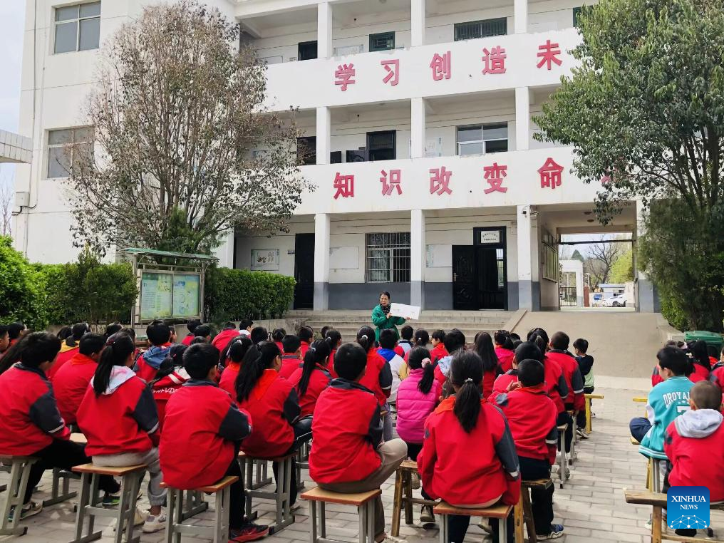 This photo taken with a mobile phone shows Jiao Meining giving a picture book class at the Renzong Central Primary School in Lintong District of Xi'an, northwest China's Shaanxi Province, April 18, 2024. (Xinhua/Sun Zhenghao)