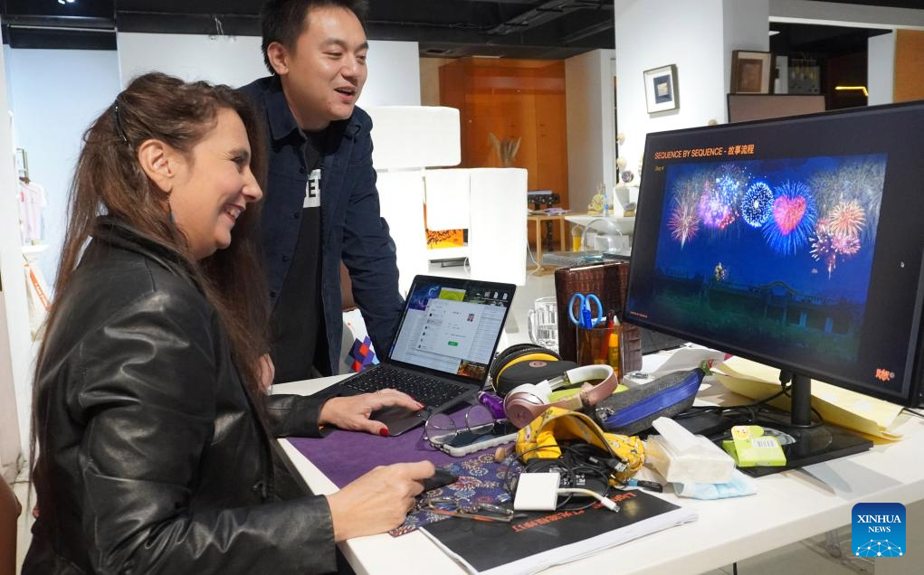 Sophie Poirier (L) talks with Zeng Ming, general manager of Wanzai Kaleidoscope Culture and Tourism Company, about a fireworks drama in Wanzai ancient town, east China's Jiangxi Province, Dec. 9, 2022. (Xinhua/Zhu Yunuo)