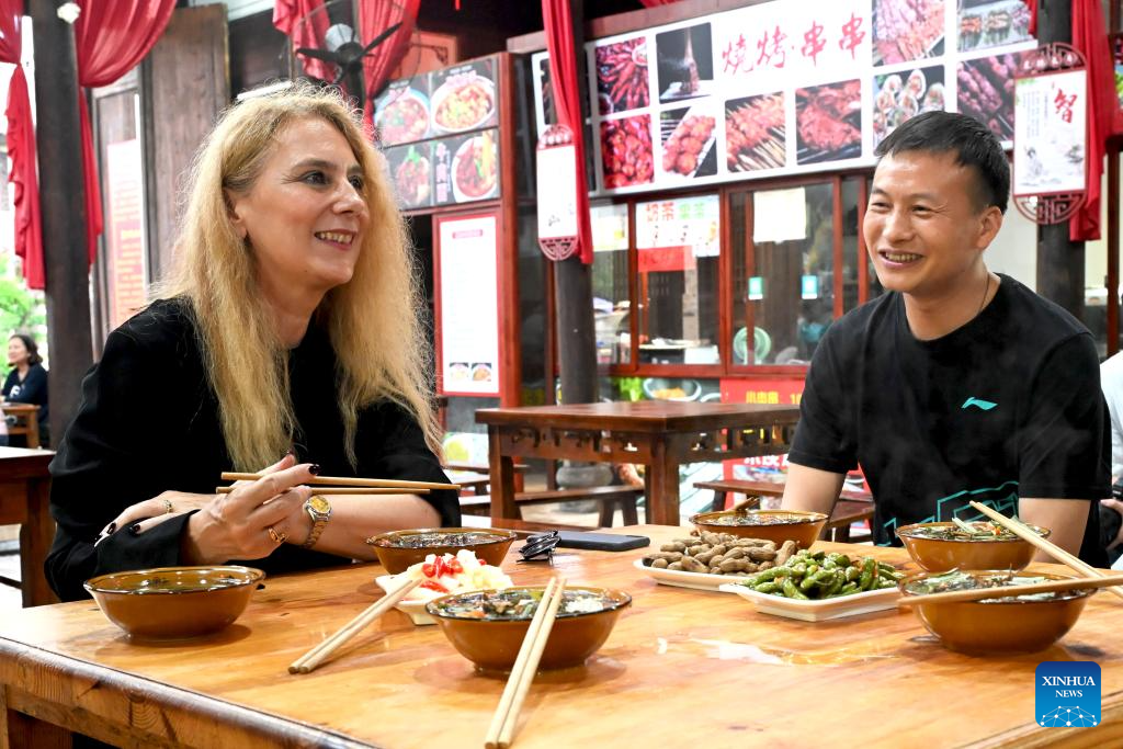 Sophie Poirier (L) talks with a local resident at a teahouse in Wanzai ancient town, east China's Jiangxi Province, May 11, 2024. (Xinhua/Sui Shangjun)