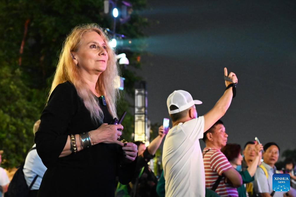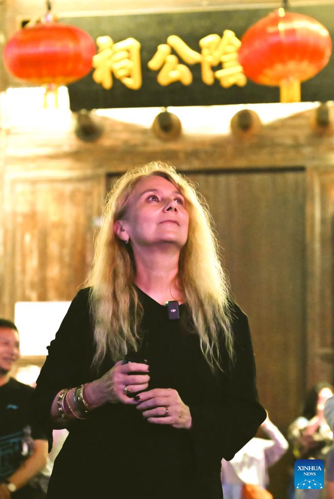 Sophie Poirier watches the fireworks drama "Love of Fireworks" in Wanzai ancient town, east China's Jiangxi Province, May 11, 2024. (Xinhua/Sui Shangjun)