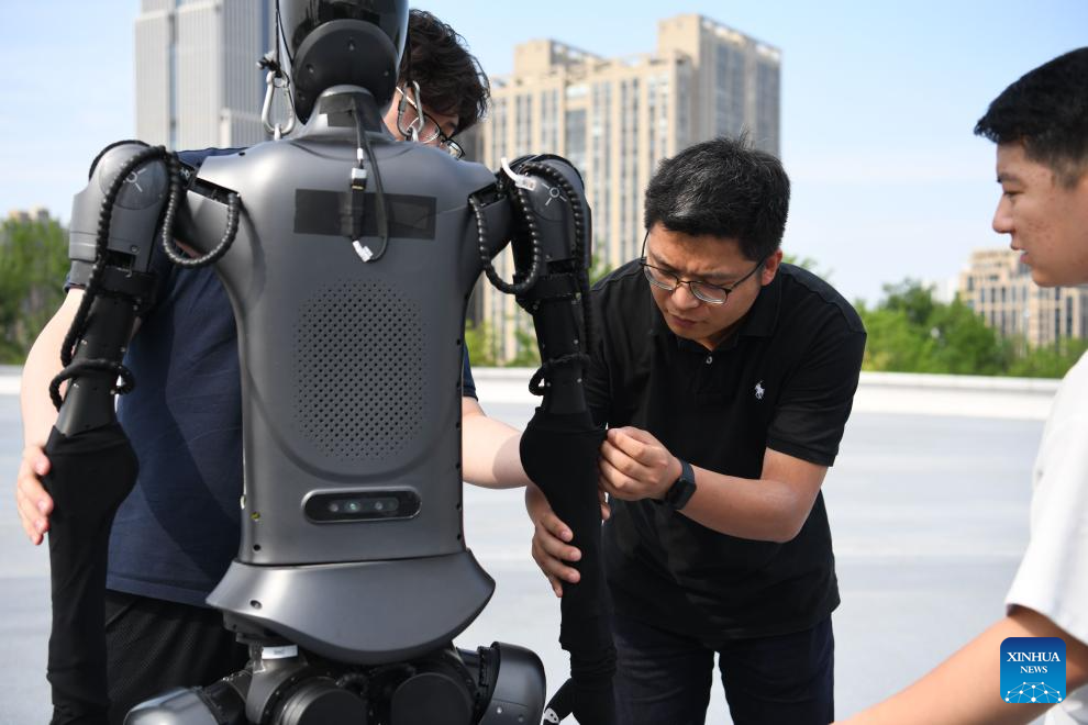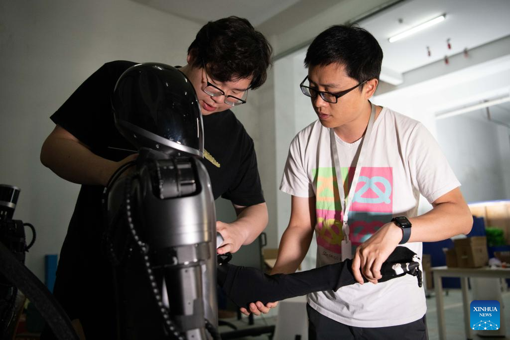 Robotics engineers Zhu Hanlin (L) and Mo An debug a humanoid robot at Chinese AI company iFLYTEK in Hefei, China's Anhui Province, May 29, 2024. The product localization of core components and the increase of innovative enterprises has injected new impetus into China's robotics industry. In central region of the country, there are a growing number of young people joining the robotics industry to boost its high-quality development. (Xinhua/Zhang Duan)