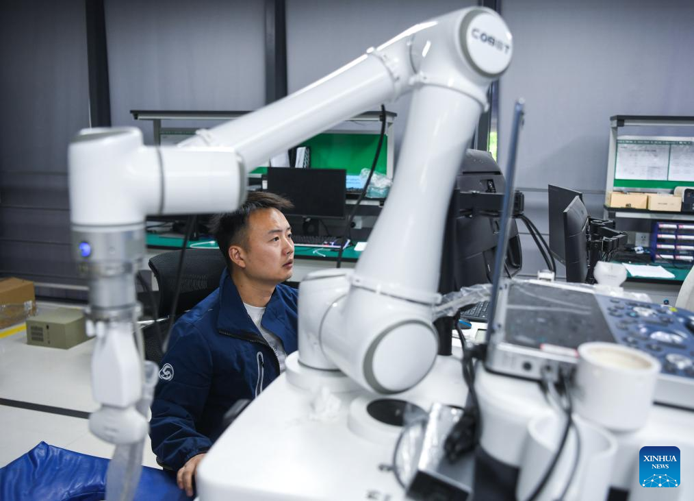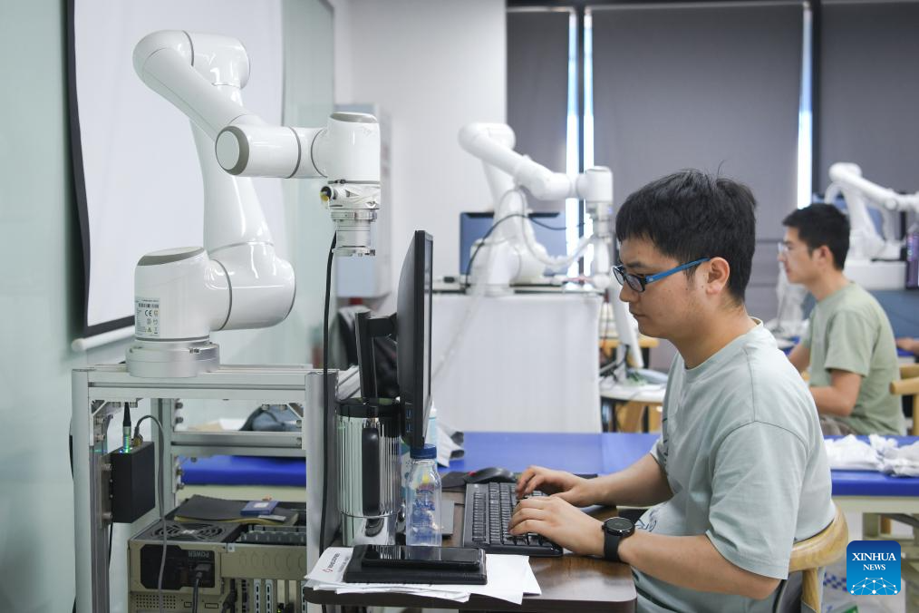 Algorithm engineer Guo Shengwei upgrades the software system for a product at Wuhan Cobot Technology Co., Ltd. in Wuhan, China's Hubei Province, June 3, 2024. The product localization of core components and the increase of innovative enterprises has injected new impetus into China's robotics industry. In central region of the country, there are a growing number of young people joining the robotics industry to boost its high-quality development. (Xinhua/Du Zixuan)