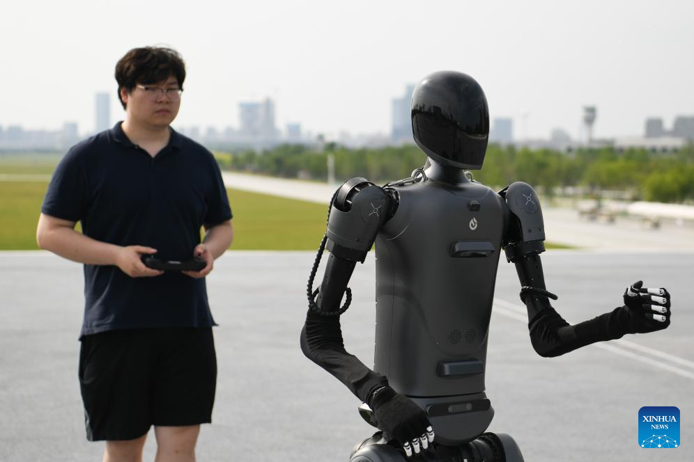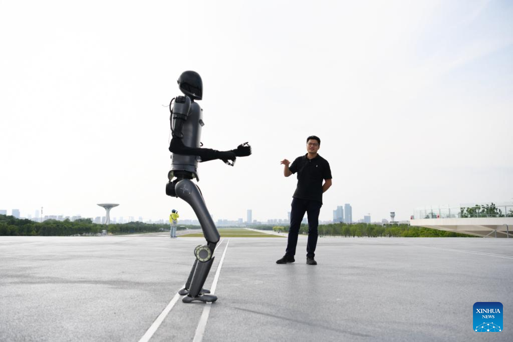Zhu Hanlin, a robotics engineer of Chinese AI company iFLYTEK, debugs a humanoid robot at a park in Hefei, China's Anhui Province, May 28, 2024. The product localization of core components and the increase of innovative enterprises has injected new impetus into China's robotics industry. In central region of the country, there are a growing number of young people joining the robotics industry to boost its high-quality development. (Xinhua/Zhang Duan)