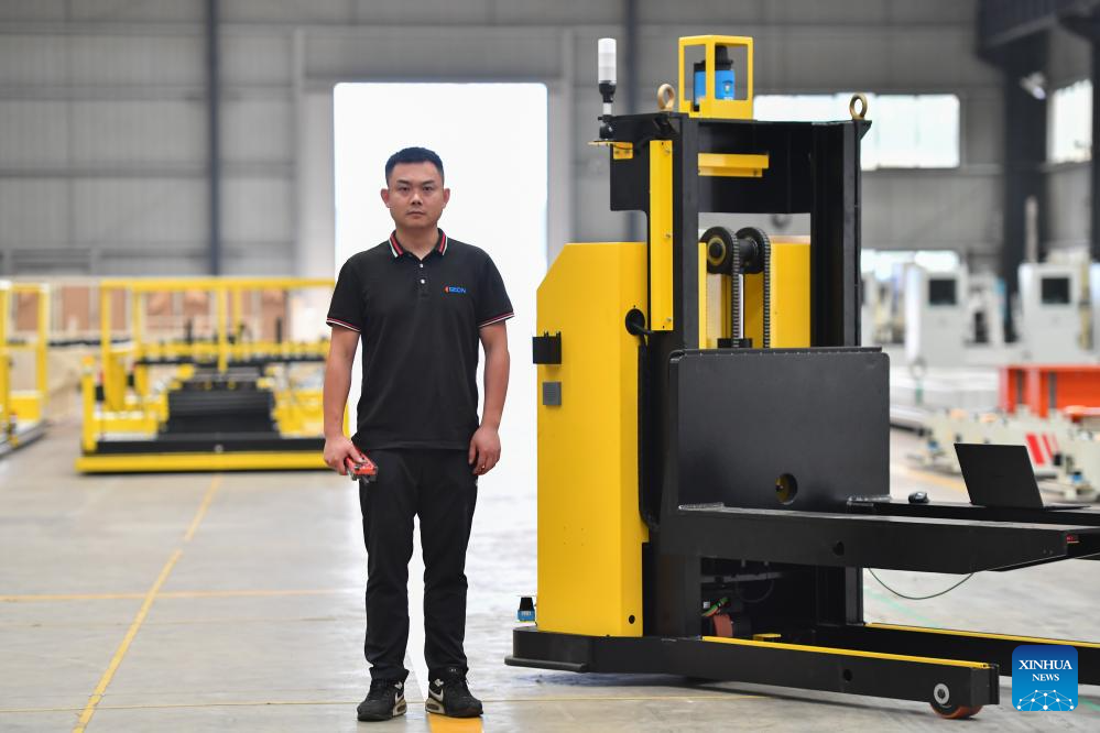Peng Kai, an industrial mobile robot engineer and a project director, poses for a photo at the robot debugging workshop of Hunan CIZON Robot Co., Ltd. in Changsha, China's Hunan Province, May 31, 2024. The product localization of core components and the increase of innovative enterprises has injected new impetus into China's robotics industry. In central region of the country, there are a growing number of young people joining the robotics industry to boost its high-quality development. (Xinhua/Chen Zeguo)