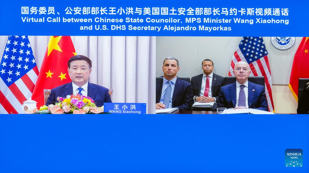BEIJING, June 6 (Xinhua) -- Chinese State Councilor and Minister of Public Security Wang Xiaohong had a video call with U.S. Homeland Security Secretary Alejandro Mayorkas on Thursday.