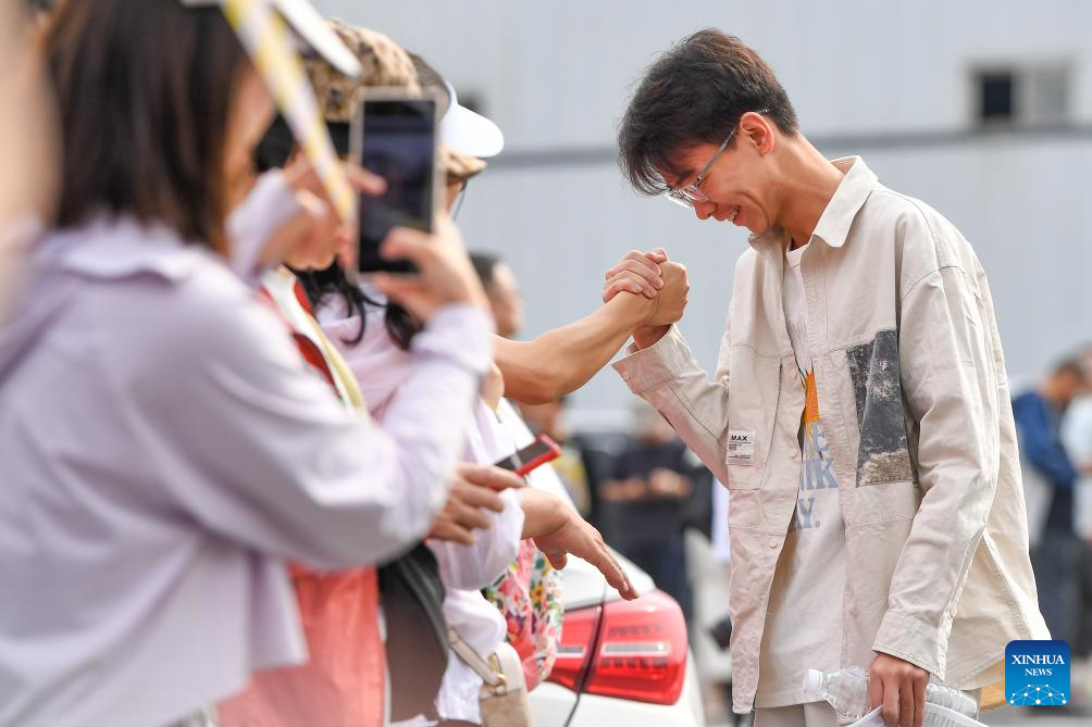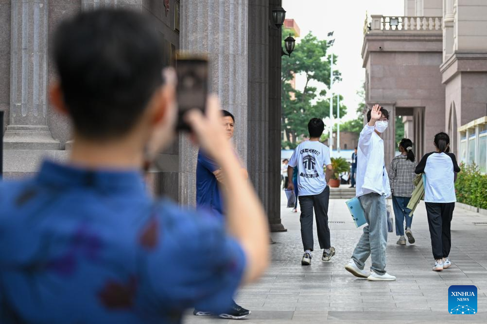 An examinee waves to his family at a national college entrance examination site in Tianjin, north China, June 7, 2024. China's national college entrance examination, known as the Gaokao, started on Friday. (Xinhua/Sun Fanyue)