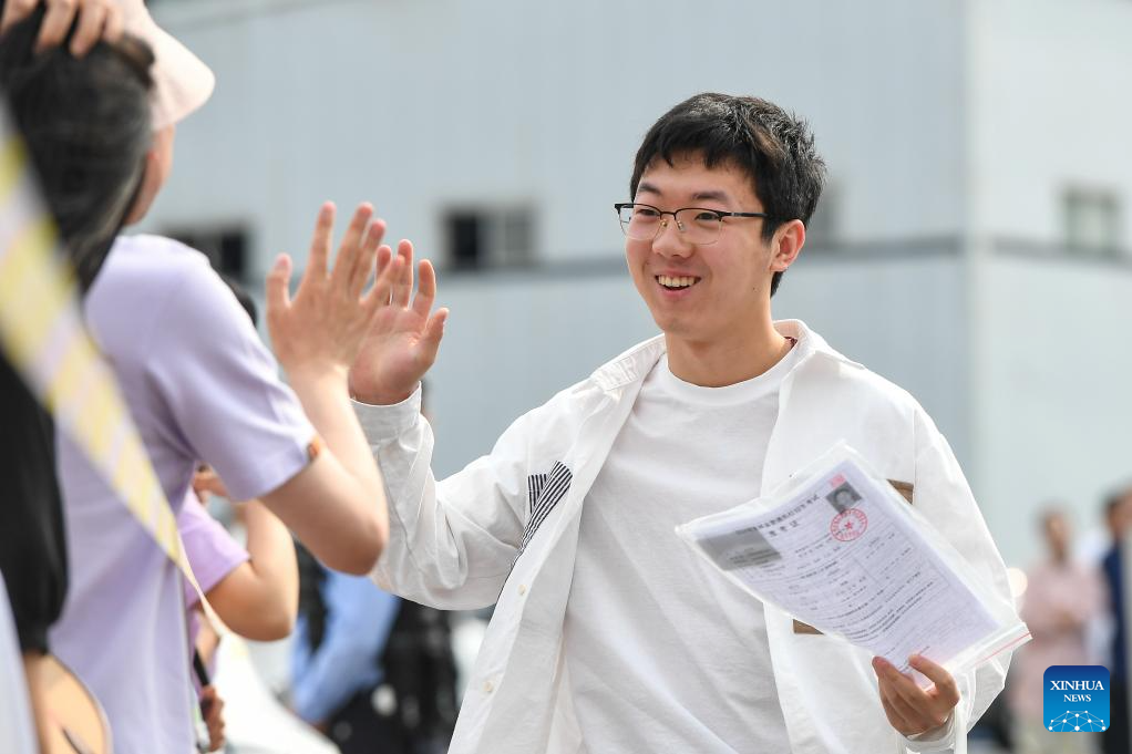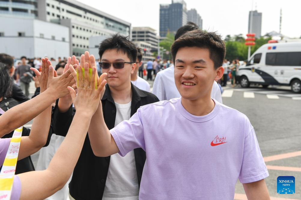 Examinees clap hands with their teachers before entering a national college entrance examination site in Changchun, northeast China's Jilin Province, June 7, 2024. China's national college entrance examination, known as the Gaokao, started on Friday. (Xinhua/Zhang Nan)