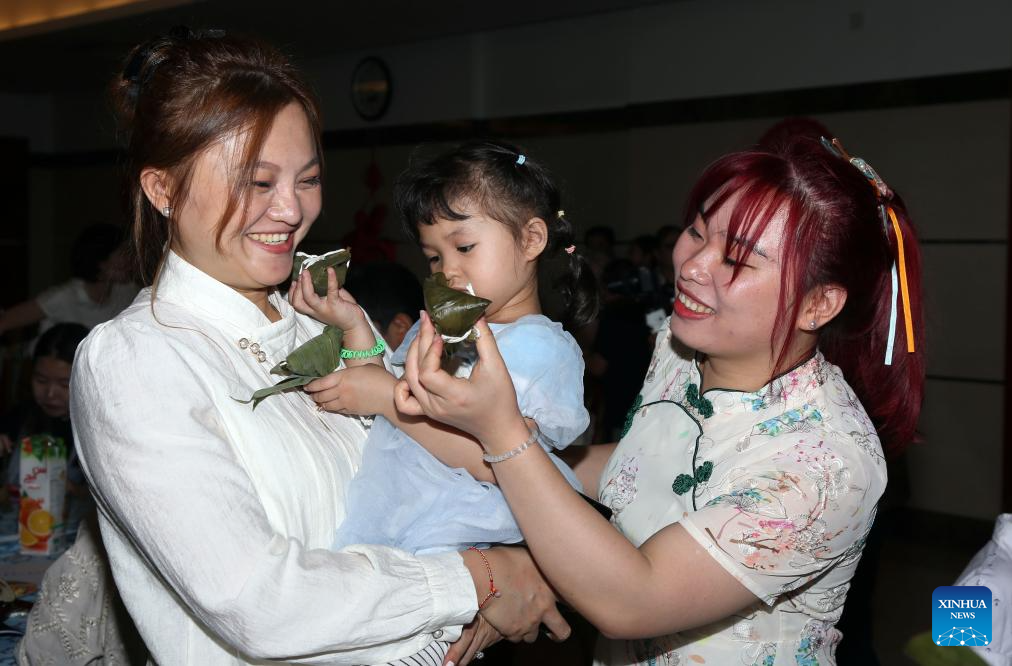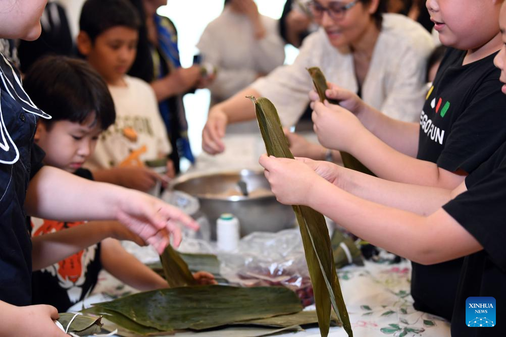 People make Zongzi, a traditional Chinese food to mark the Dragon Boat Festival, during a party organized by the Chinese Embassy in Iran, in the Iranian capital Tehran, June 5, 2024. More than 50 people attended the party. (Xinhua/Shadati)