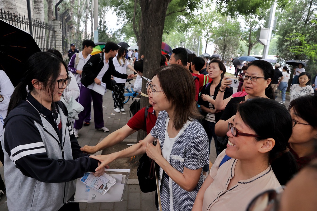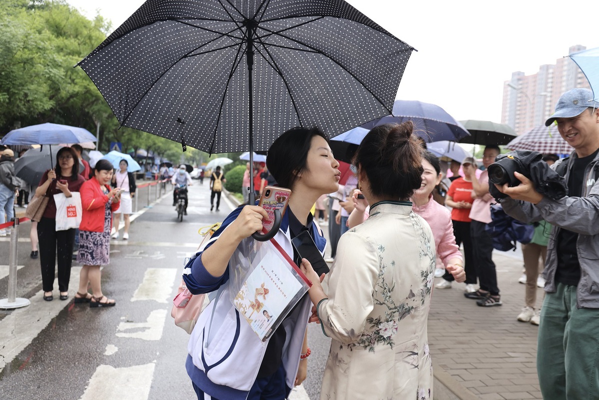A mother encourages her daughter before the start of her national college entrance examination, or gaokao, at the Chaoyang Campus of High School Affiliated to Renmin University on June 7, 2024. [Photo by Wang Jing/chinadaily.com.cn]