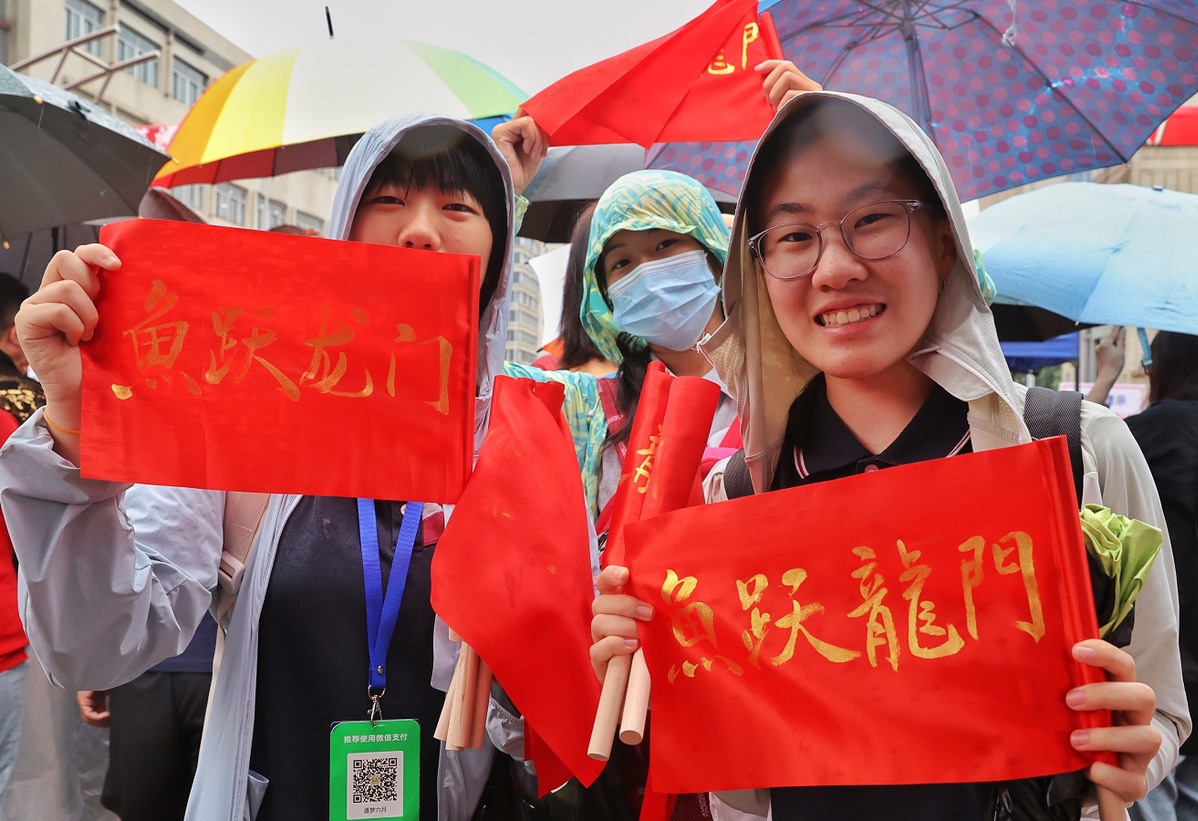 Students cheer for examinees who are about to take the national college entrance exam, or gaokao, at the Wangjing Campus of Beijing No 80 High School on June 7, 2024. [Photo by Jiang Dong/chinadaily.com.cn]