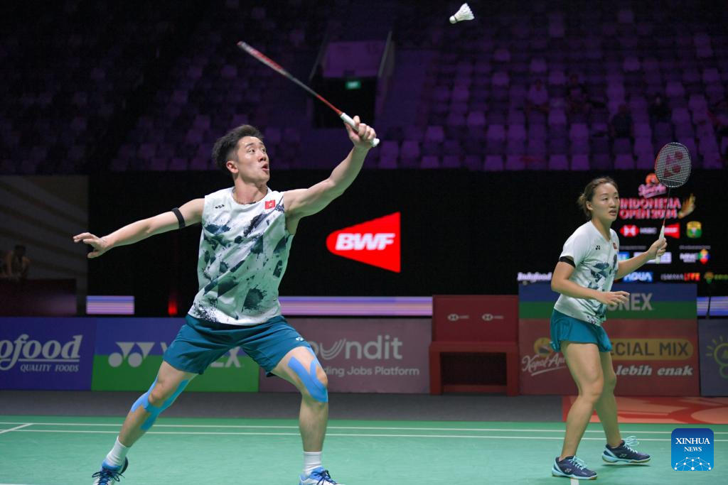 Tang Chun Man (L)/Tse Ying Suet compete during the mixed doubles quarterfinal match between Zheng Siwei/Huang Yaqiong of China and Tang Chun Man/Tse Ying Suet of China's Hong Kong at 2024 Indonesia Open badminton tournament in Jakarta, Indonesia, June 7, 2024. (Xinhua/Xu Qin)