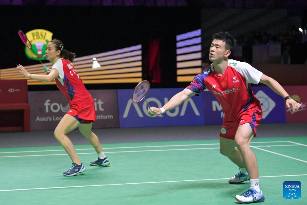 Zheng Siwei (R)/Huang Yaqiong compete during the mixed doubles quarterfinal match between Zheng Siwei/Huang Yaqiong of China and Tang Chun Man/Tse Ying Suet of China's Hong Kong at 2024 Indonesia Open badminton tournament in Jakarta, Indonesia, June 7, 2024. (Xinhua/Xu Qin)