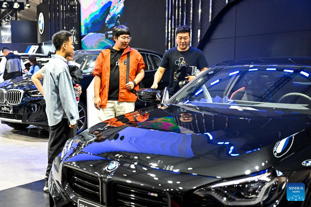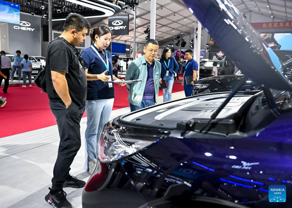 Visitors view a vehicle at an auto show in Hohhot, north China's Inner Mongolia Autonomous Region, June 7, 2024. The 16th Hohhot International Auto Show kicked off at Inner Mongolia International Convention & Exhibition Center in Hohhot on Friday, and will last until June 11. (Xinhua/Li Zhipeng)