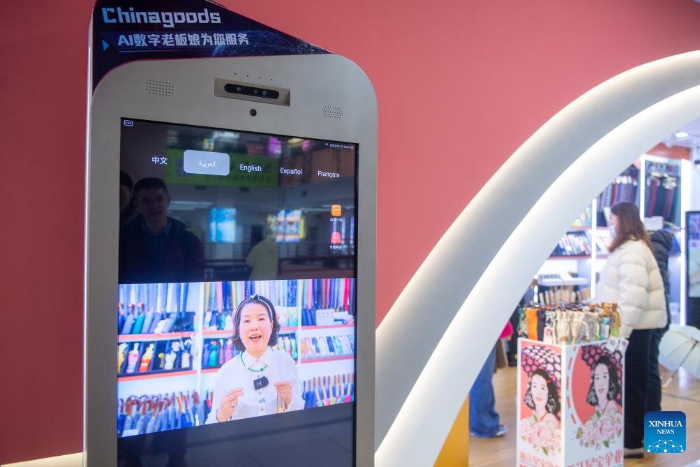 This photo taken on Feb. 21, 2024 shows a multilingual product introduction video using AI technology at Yiwu International Trade Market in Yiwu, east China's Zhejiang Province. (Xinhua/Jiang Han)