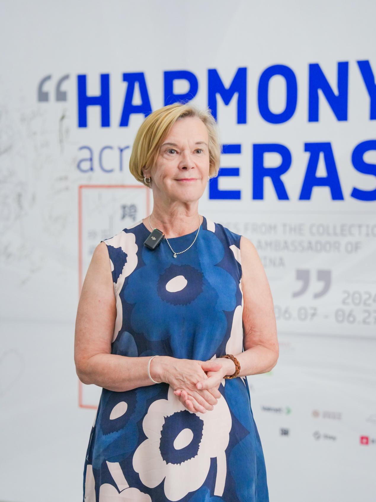Photo shows Finnish Ambassador Leena-Kaisa Mikkola attending the “Harmony Across Eras” art exhibition in Beijing on June 6, 2024. (Photo courtesy of the Embassy of Finland in China)