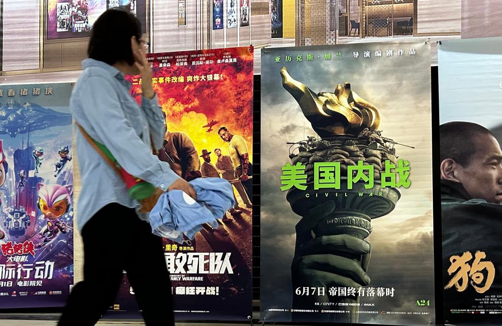 This photo taken with a mobile phone shows a woman walking past a poster of the U.S. movie "Civil War" at a cinema in Beijing, capital of China, June 7, 2024. (Xinhua/Shen Anni)