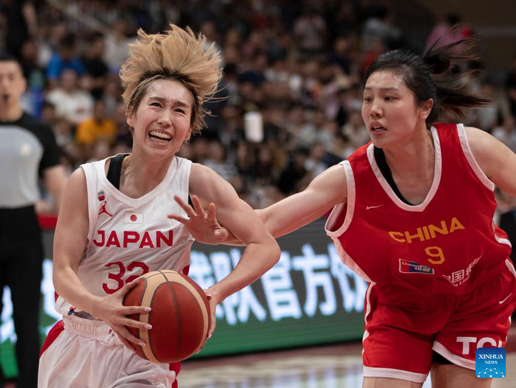 Zhang Ru (R) of China vies with Miyazaki Saori of Japan during a friendly match between China and Japan at the women's basketball pre-Olympic warm-up series in Xi'an, northwest China's Shaanxi Province, June 7, 2024. (Xinhua/Luo Yuan)