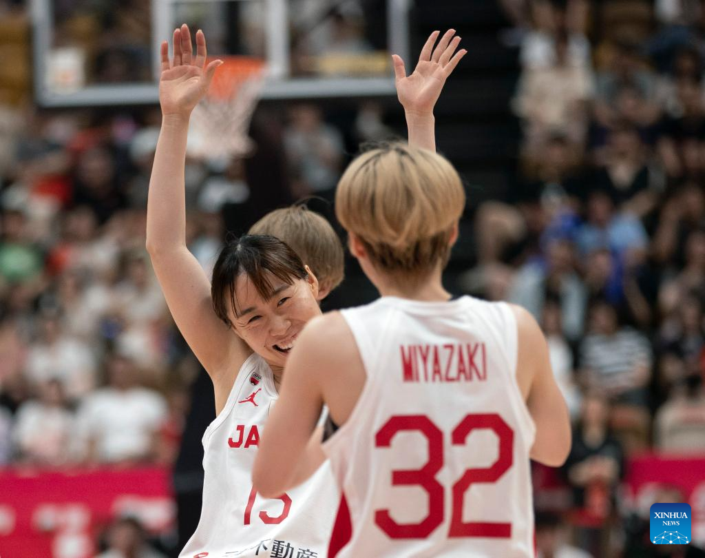 Motohashi Nako (L) of Japan celebrates scoring during a friendly match between China and Japan at the women's basketball pre-Olympic warm-up series in Xi'an, northwest China's Shaanxi Province, June 7, 2024. (Xinhua/Luo Yuan)
