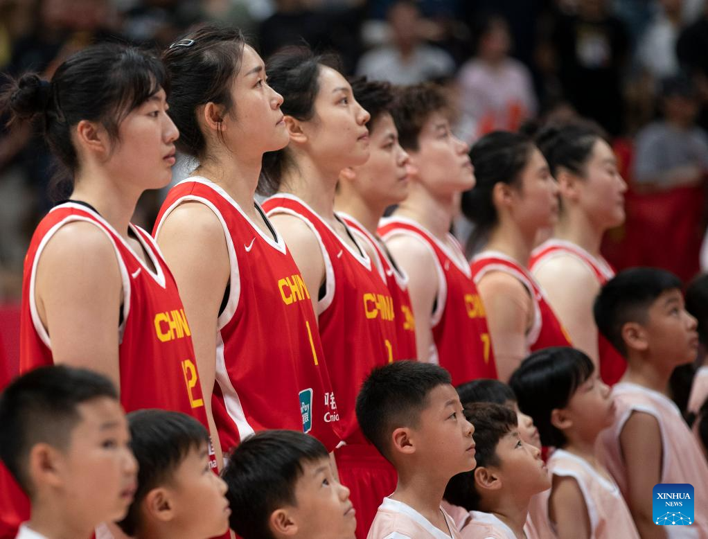 Players of China react before a friendly match between China and Japan at the women's basketball pre-Olympic warm-up series in Xi'an, northwest China's Shaanxi Province, June 7, 2024. (Xinhua/Luo Yuan)