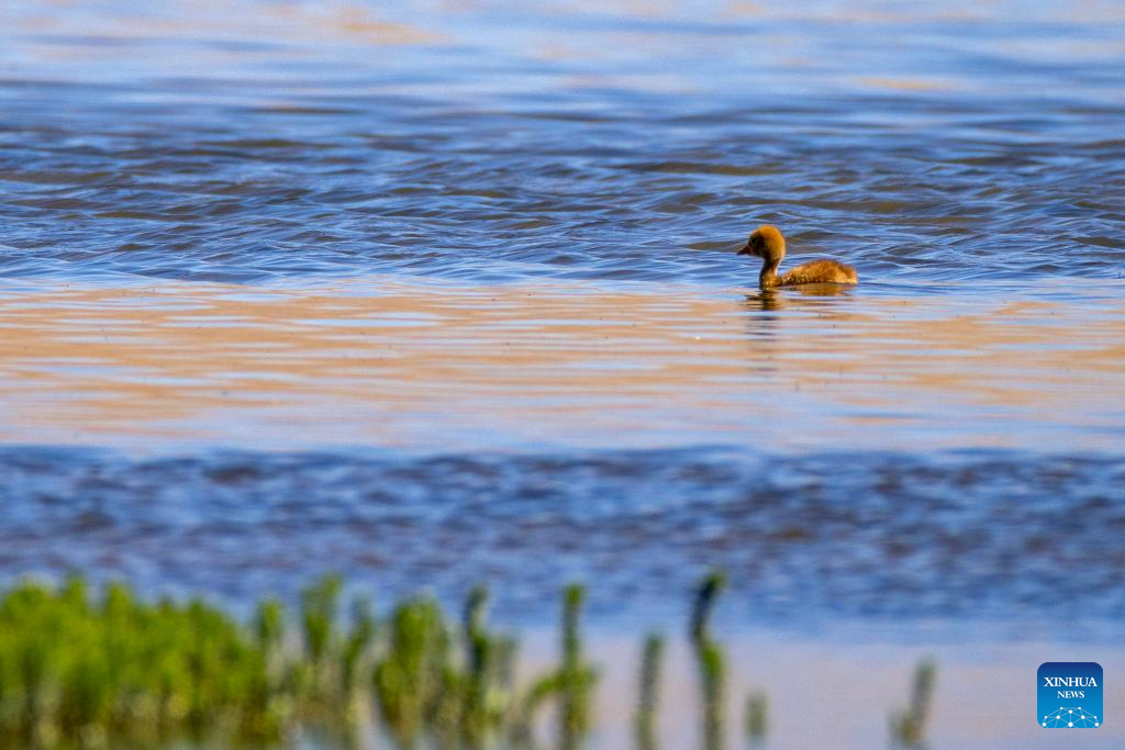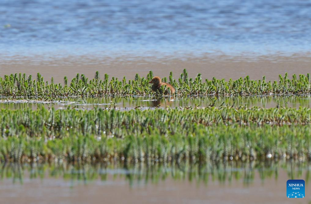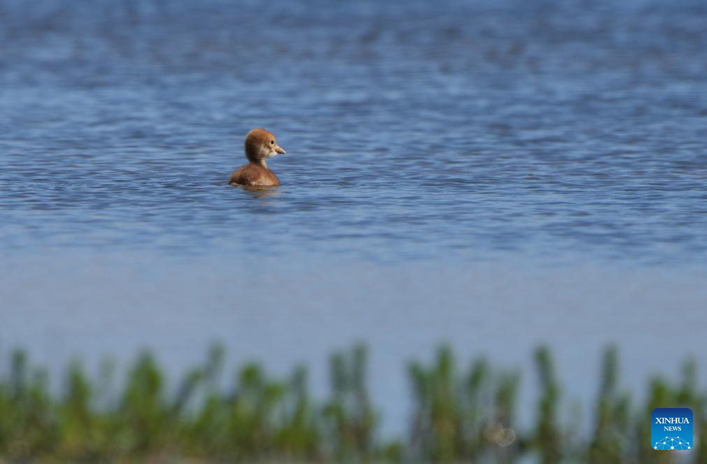 A black-necked crane baby is seen at a wetland in Xainza County of Nagqu City, southwest China's Xizang Autonomous Region, June 9, 2024. Black-necked crane couples are breeding babies in wetlands at an altitude of about 4,700 meters in Xainza County. Every year around the time of June, pairs of black-necked cranes migrate to Xainza County to hatch eggs on grass piers surrounded by water. The black-necked crane, a species under first-class state protection in China, mainly inhabits plateau meadows and marshes at an altitude of 2,500 to 5,000 meters. (Xinhua/Jiang Fan)