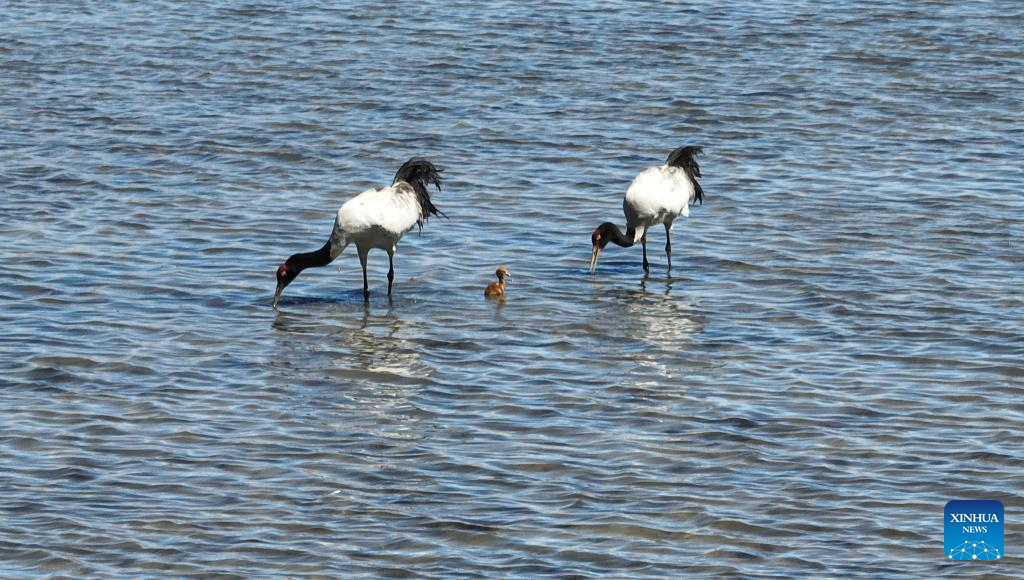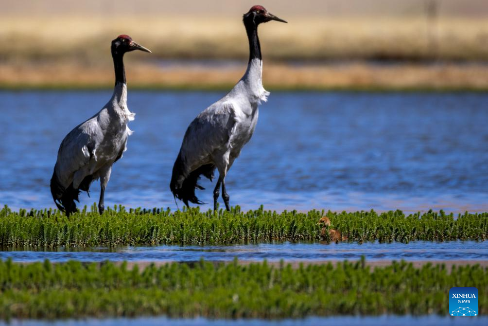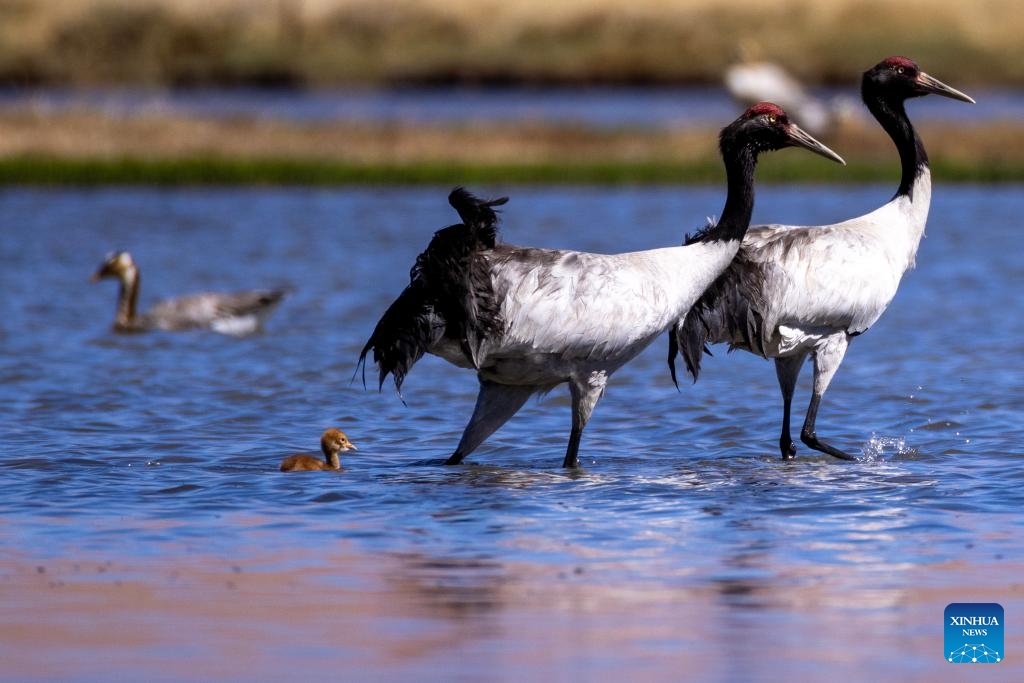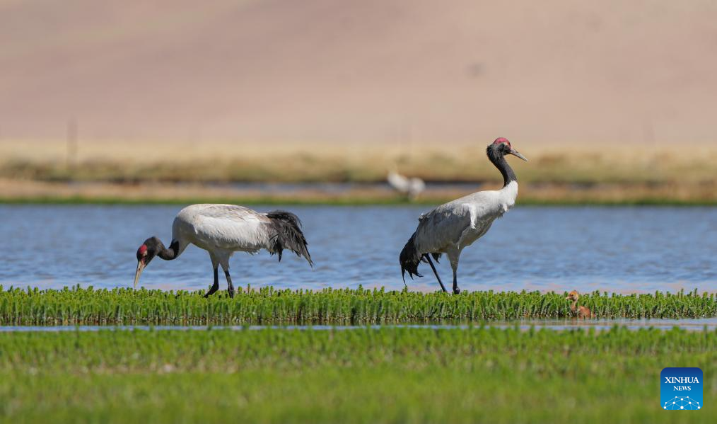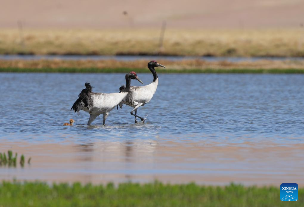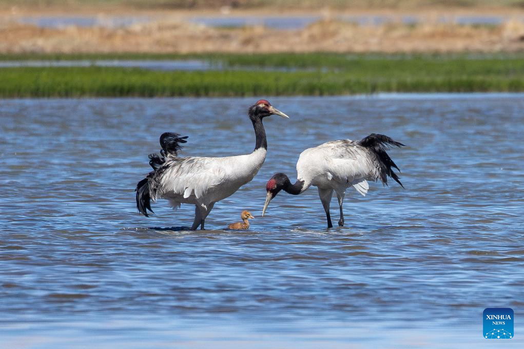 Two black-necked cranes and their baby are seen at a wetland in Xainza County of Nagqu City, southwest China's Xizang Autonomous Region, June 9, 2024. Black-necked crane couples are breeding babies in wetlands at an altitude of about 4,700 meters in Xainza County. Every year around the time of June, pairs of black-necked cranes migrate to Xainza County to hatch eggs on grass piers surrounded by water. The black-necked crane, a species under first-class state protection in China, mainly inhabits plateau meadows and marshes at an altitude of 2,500 to 5,000 meters. (Xinhua/Jiang Fan)