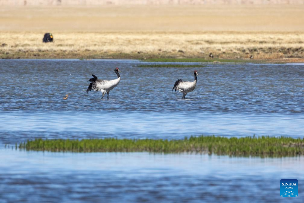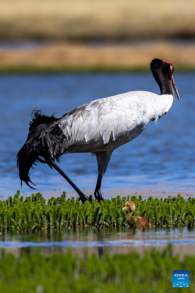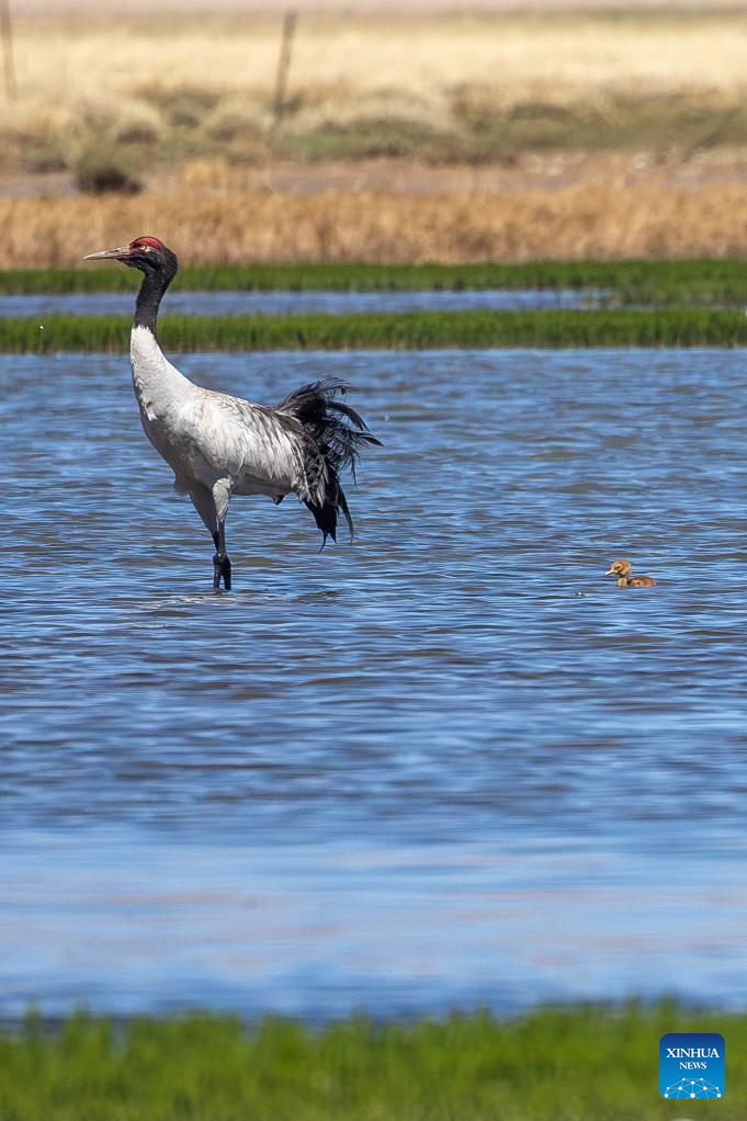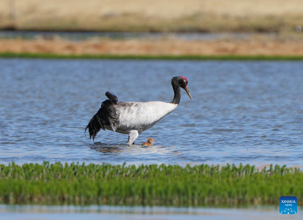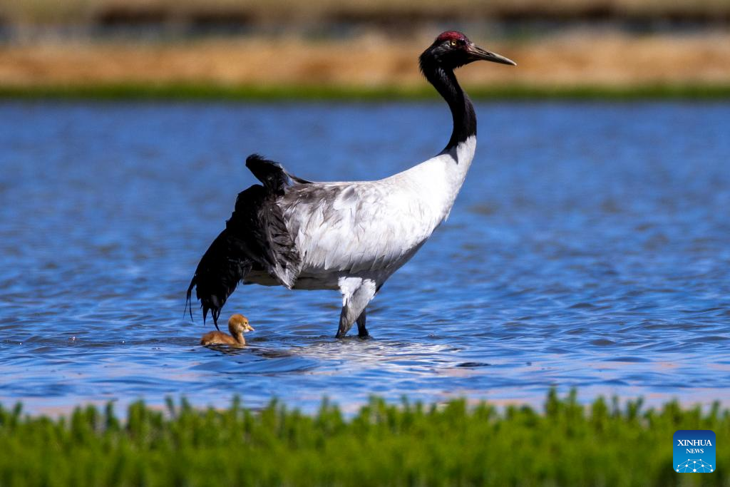 A black-necked crane and its baby are seen at a wetland in Xainza County of Nagqu City, southwest China's Xizang Autonomous Region, June 9, 2024. Black-necked crane couples are breeding babies in wetlands at an altitude of about 4,700 meters in Xainza County. Every year around the time of June, pairs of black-necked cranes migrate to Xainza County to hatch eggs on grass piers surrounded by water. The black-necked crane, a species under first-class state protection in China, mainly inhabits plateau meadows and marshes at an altitude of 2,500 to 5,000 meters. (Xinhua/Jiang Fan)