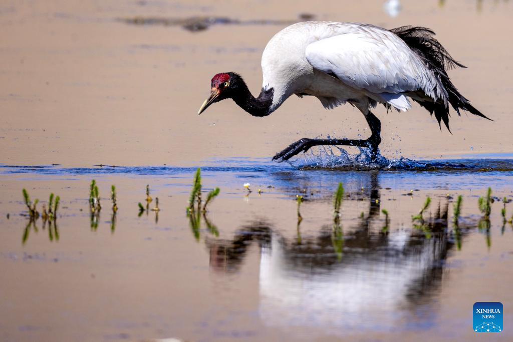 A black-necked crane forages at a wetland in Xainza County of Nagqu City, southwest China's Xizang Autonomous Region, June 9, 2024. Black-necked crane couples are breeding babies in wetlands at an altitude of about 4,700 meters in Xainza County. Every year around the time of June, pairs of black-necked cranes migrate to Xainza County to hatch eggs on grass piers surrounded by water. The black-necked crane, a species under first-class state protection in China, mainly inhabits plateau meadows and marshes at an altitude of 2,500 to 5,000 meters. (Xinhua/Jiang Fan)