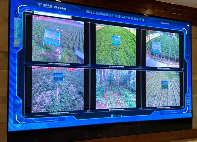 Photo shows the real-time footage of planting bases of traditional Chinese medicinal herbs displayed at a traceability platform of the Chongqing Taiji Industry (Group) Co., Ltd. (Taiji Group), a subsidiary of Sinopharm. (People's Daily Online/Li Meiyu)