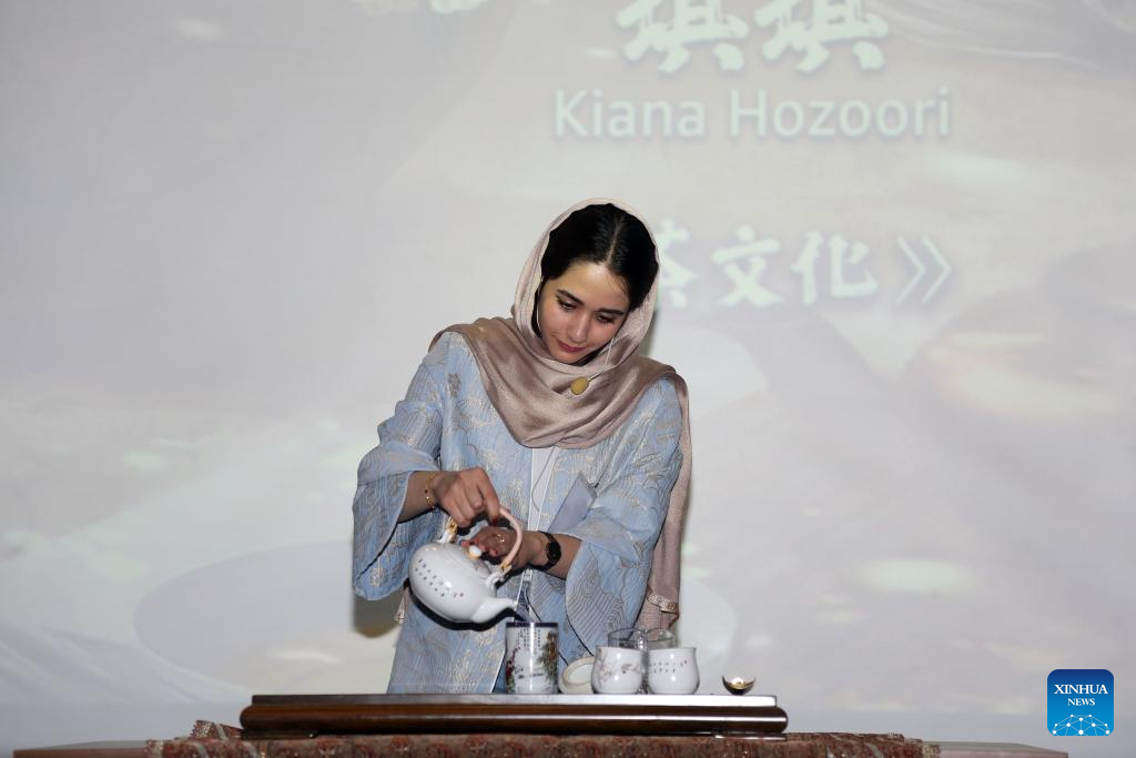 A competitor performs Chinese tea ceremony during a talent show of the final round of the "Chinese Bridge" language proficiency competition for Iranian college students held at Allameh Tabataba'i University in Tehran, Iran, June 10, 2024.?(Xinhua/Shadati)