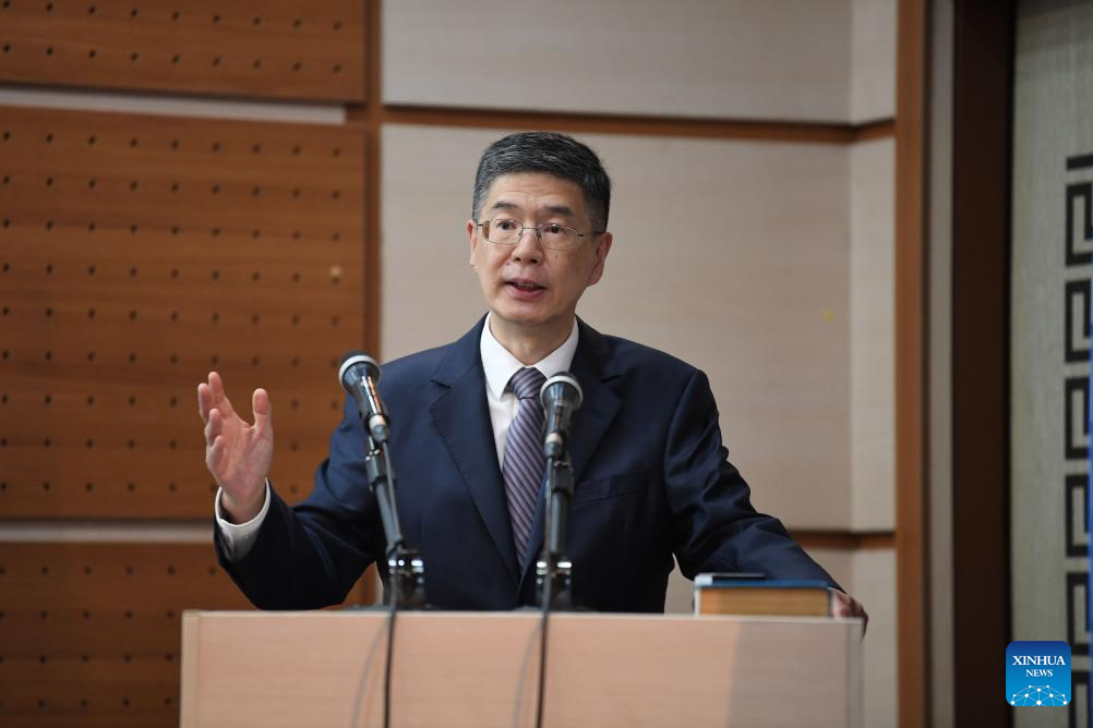 Chinese Ambassador to Iran Cong Peiwu speaks at the final round of the "Chinese Bridge" language proficiency competition for Iranian college students held at Allameh Tabataba'i University in Tehran, Iran, June 10, 2024. (Xinhua/Shadati)