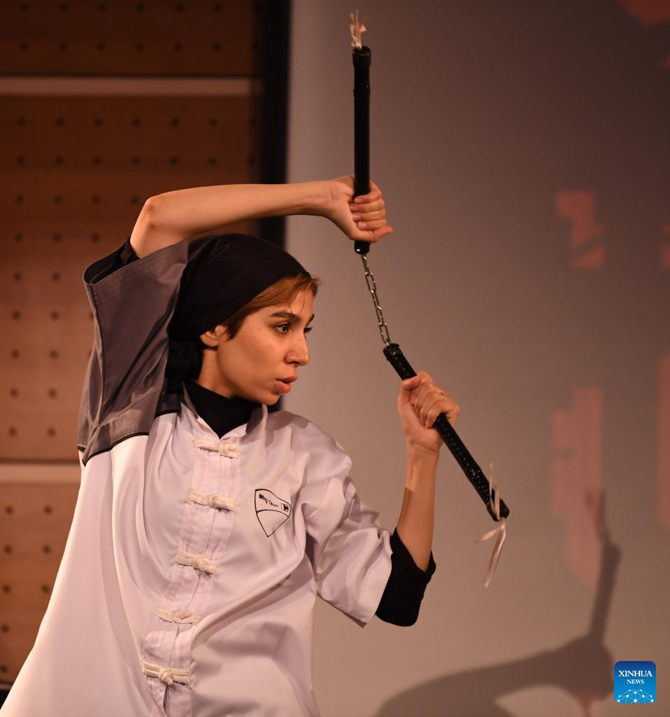 Mahtab Montazeri Hedesh, the first-prize winner, performs nunchaku tactics during a talent show of the final round of the "Chinese Bridge" language proficiency competition for Iranian college students held at Allameh Tabataba'i University in Tehran, Iran, June 10, 2024.?(Xinhua/Shadati)