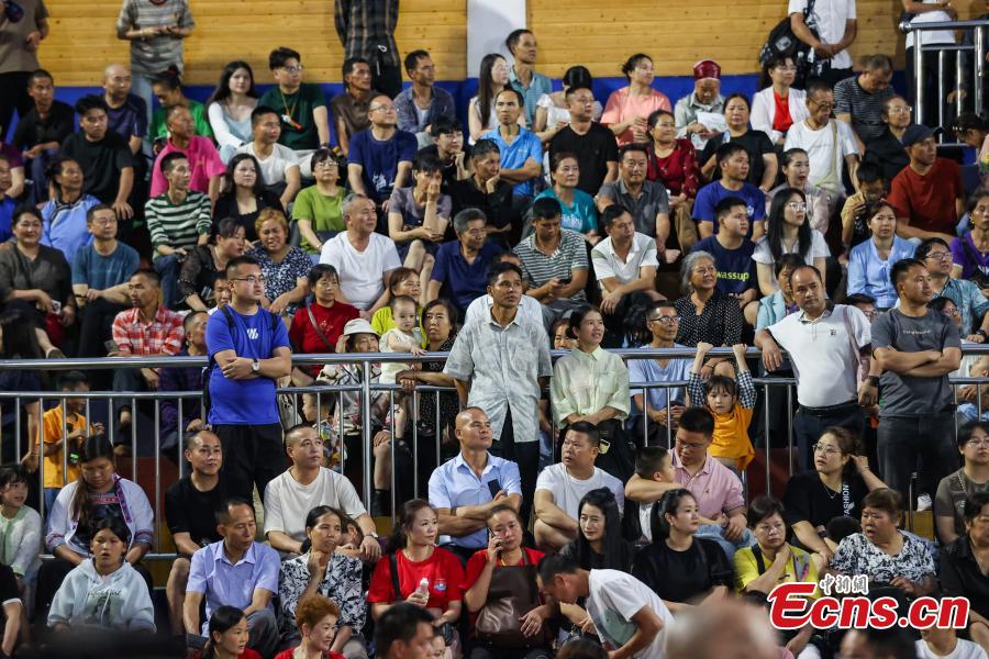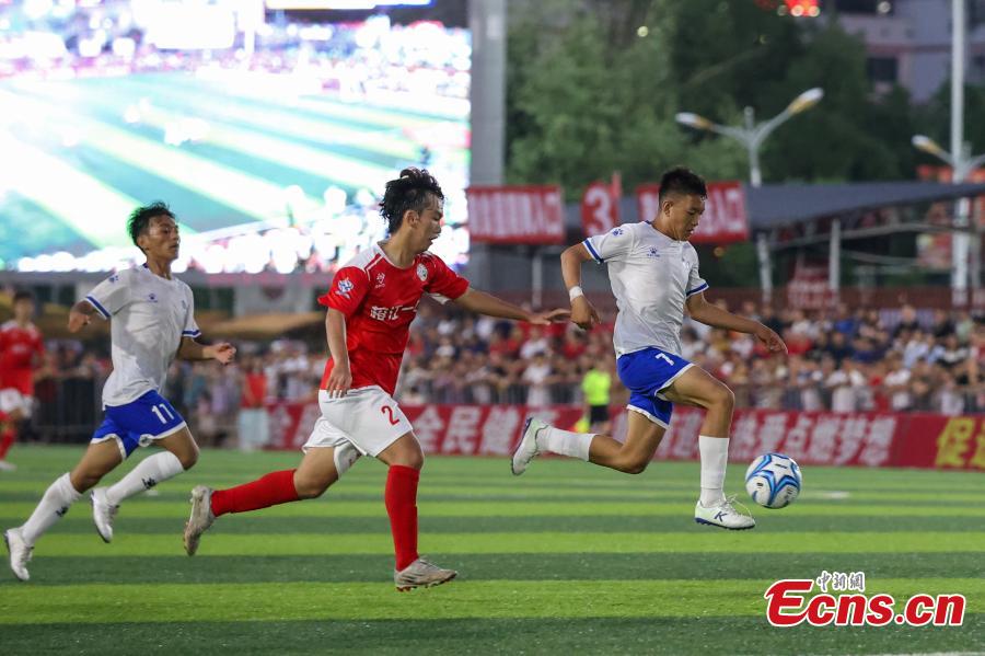 Members of the Qomolangma Snow Eagle Team (white) compete with members of the Banchao team in a friendly match in Rongjiang County, Qiandongnan Miao and Dong Autonomous Prefecture, Guizhou Province, June 10, 2024. (Photo: China News Service/ Qu Honglun)