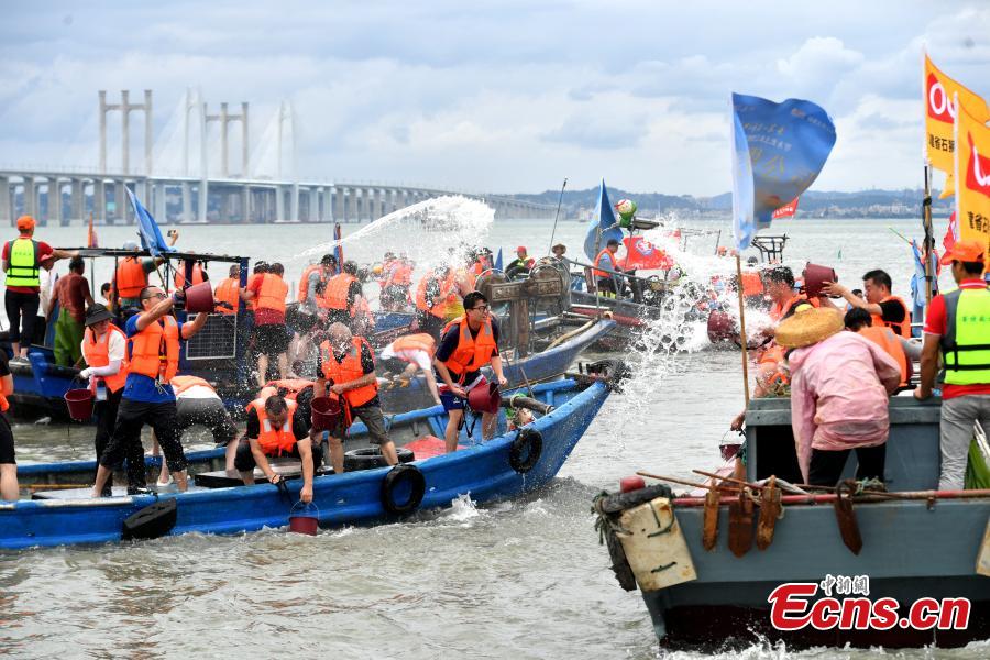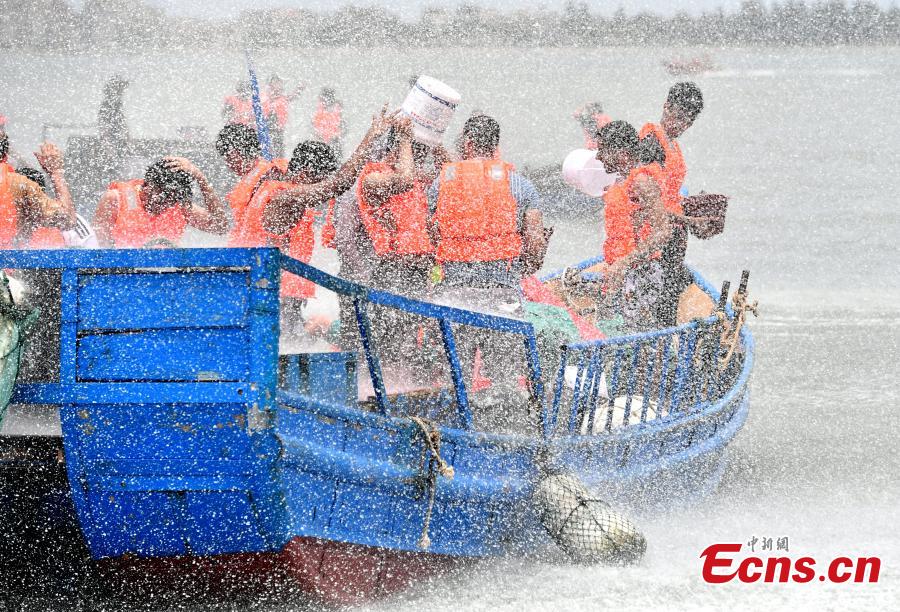 The people from both sides of the Taiwan Straits splash water on the sea to welcome the Dragon Boat Festival in Shishi, Quanzhou, Fujian province on the Dragon Boat Festival, June 10. (Photo: China News Service/ Lyu Ming)