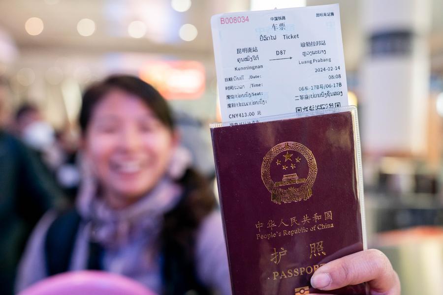 A passenger shows her passport and a train ticket to Luang Prabang of the Laos via the China-Laos Railway, in Kunming, southwest China's Yunnan Province, Feb. 14, 2024. (Xinhua/Hu Chao)