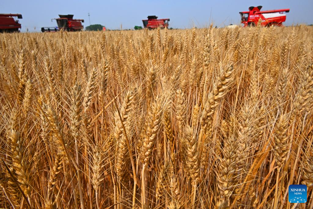 Combine harvesters reap wheat in a field in Dachang Town of Xihai'an (West Coast) New Area in Qingdao, east China's Shandong Province, June 11, 2024. In east China's Shandong Province, China's second-largest wheat-producing area, a variety of loss-cutting activities have been carried out in each county and city with wheat plantation areas exceeding 4 million hectares. Meanwhile, more than 1.5 million sets of agricultural machinery are joining in the harvest in Shandong. (Xinhua/Li Ziheng)