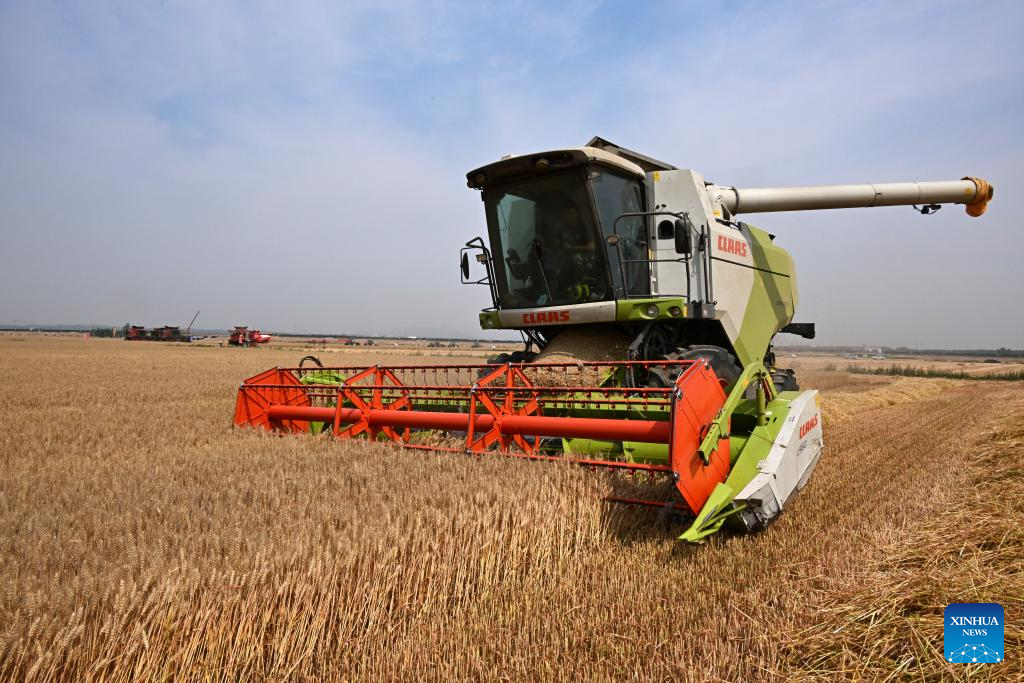 A combine harvester works in a wheat field in Dachang Town of Xihai'an (West Coast) New Area in Qingdao, east China's Shandong Province, June 11, 2024. In east China's Shandong Province, China's second-largest wheat-producing area, a variety of loss-cutting activities have been carried out in each county and city with wheat plantation areas exceeding 4 million hectares. Meanwhile, more than 1.5 million sets of agricultural machinery are joining in the harvest in Shandong. (Xinhua/Li Ziheng)