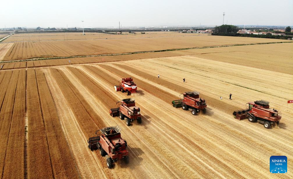 An aerial drone photo shows combine harvesters reaping wheat in a field in Dachang Town of Xihai'an (West Coast) New Area in Qingdao, east China's Shandong Province, June 11, 2024. In east China's Shandong Province, China's second-largest wheat-producing area, a variety of loss-cutting activities have been carried out in each county and city with wheat plantation areas exceeding 4 million hectares. Meanwhile, more than 1.5 million sets of agricultural machinery are joining in the harvest in Shandong. (Xinhua/Li Ziheng)