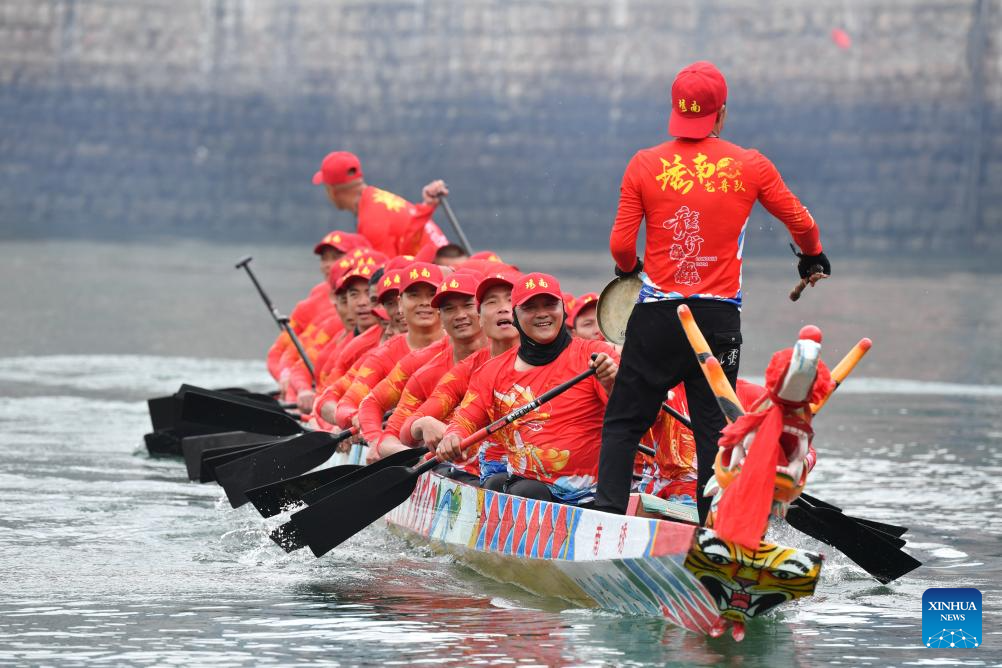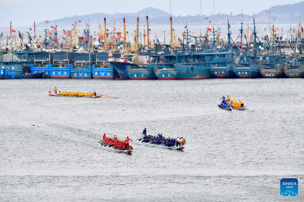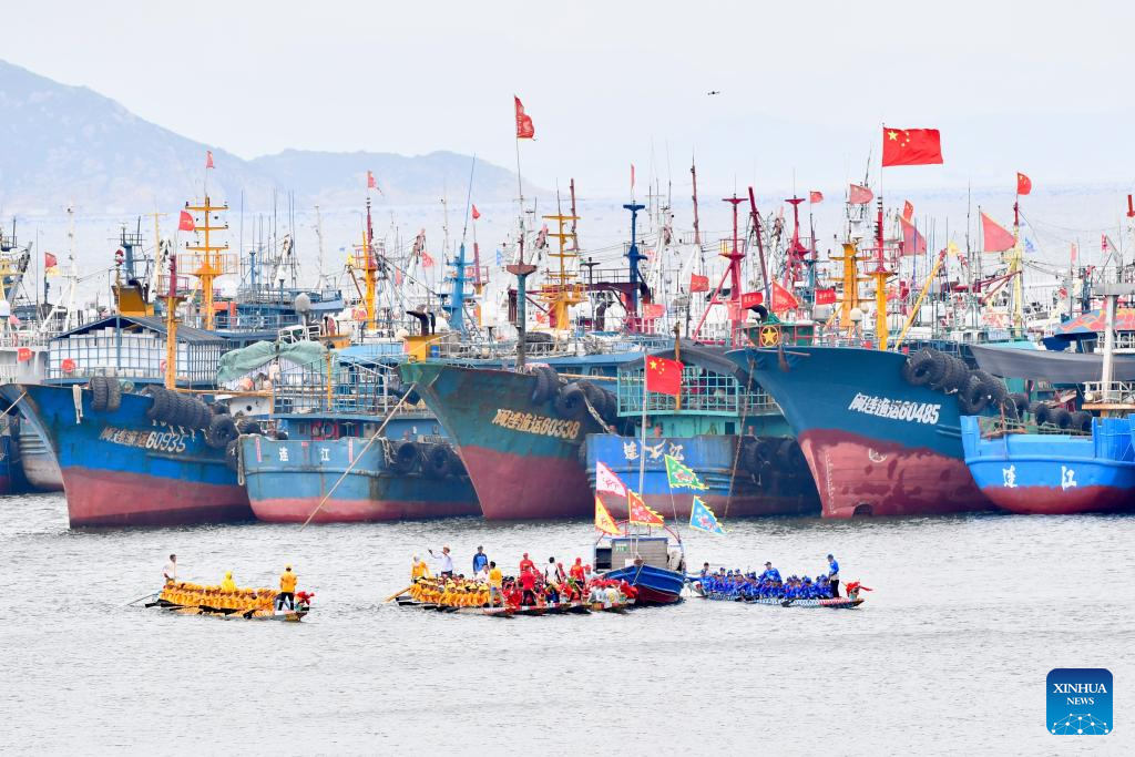 Contestants participate in a dragon boat race at a fishing port in Lianjiang County, southeast China's Fujian Province, June 11, 2024. The dragon boat race at sea has a long history in Lianjiang. The eight-day event from the first day of the fifth month of the Chinese lunar calendar has become a well-known cultural activity to celebrate the Dragon Boat Festival, also called Duanwu Festival. (Xinhua/Jiang Kehong)