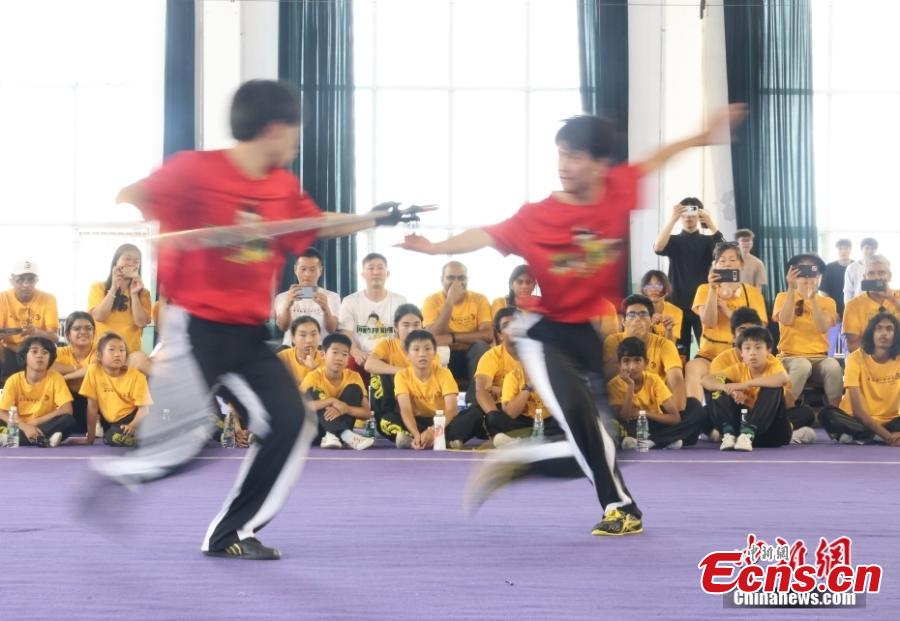 The delegation watches martial arts performances by university students. (Photo: China News Service/ Yang Kejia)