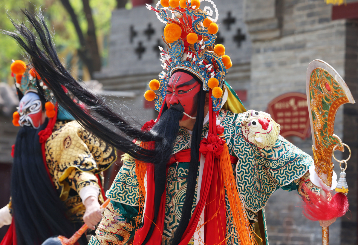 Wu Lingyun (middle) and his colleagues stage a performance at Grand Guan Di Temple in Taiyuan, Shanxi province, on April 22. (ZHU XINGXIN/CHINA DAILY)