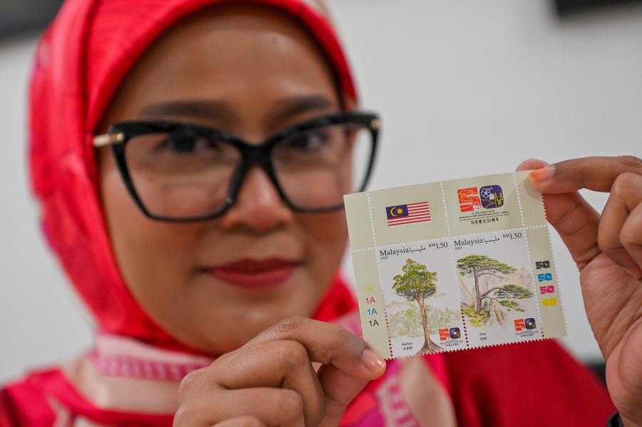 A person shows stamps marking the 50th anniversary of the establishment of diplomatic ties between Malaysia and China in Kuala Lumpur, Malaysia, May 31, 2024. (Photo by Chong Voon Chung/Xinhua)