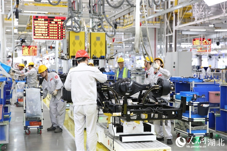 The first domestic automated AGV production line in the light truck industry boosts production efficiency at Dongfeng Motor Corporation's smart manufacturing and green factory in Xiangyang, central China's Hubei Province. (People's Daily Online/Wang Guoji)
