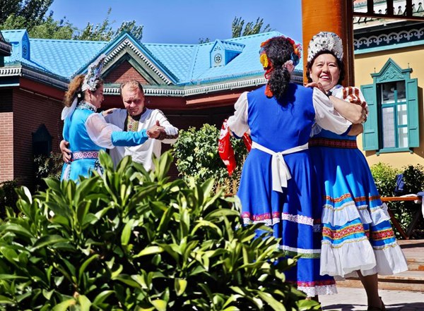Residents of the Russian ethnic group perform folk dance on Liuxing Street in Yining City, Ili Kazak Autonomous Prefecture, northwest China's Xinjiang Uygur Autonomous Region, May 28, 2024. (Xinhua/Wang Fei)