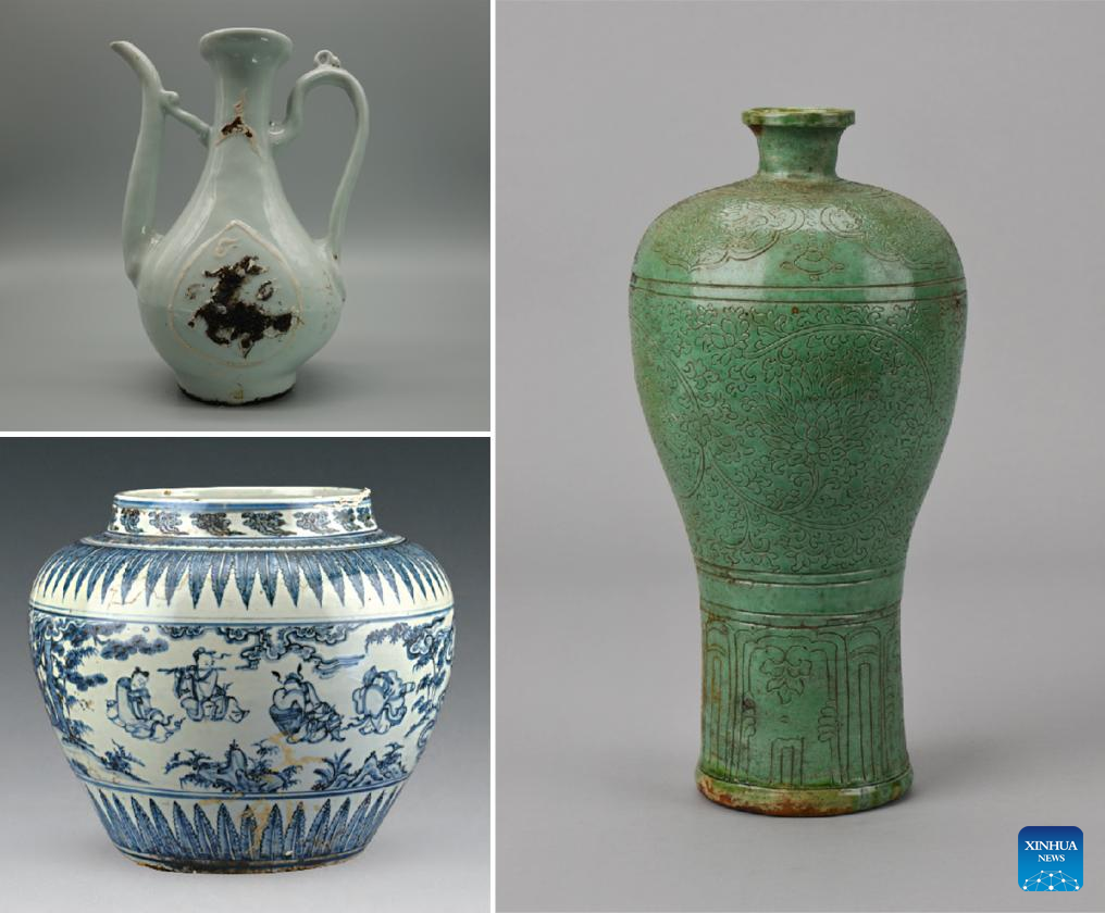 This undated combo photo shows pieces of cultural relics retrieved from two ancient shipwrecks discovered in the South China Sea. More than 900 pieces of cultural relics have been retrieved from two ancient shipwrecks discovered in the South China Sea, the National Cultural Heritage Administration (NCHA) said Thursday. (NCHA/Handout via Xinhua)