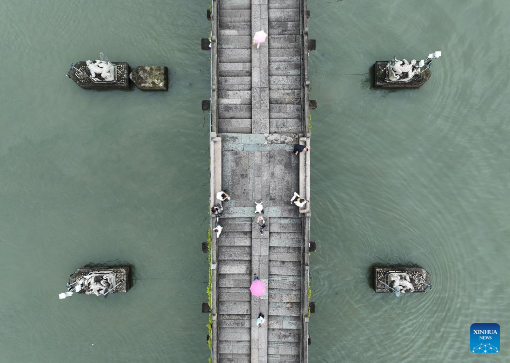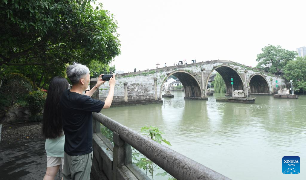 Visitors take photos of the Gongchen Bridge over the Grand Canal in Hangzhou, east China's Zhejiang Province, June 12, 2024. (Xinhua/Weng Xinyang)