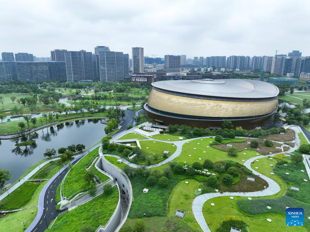 An aerial drone photo taken on June 12, 2024 shows the Gongshu Canal Sports Park Gymnasium in Hangzhou, east China's Zhejiang Province. (Xinhua/Weng Xinyang)