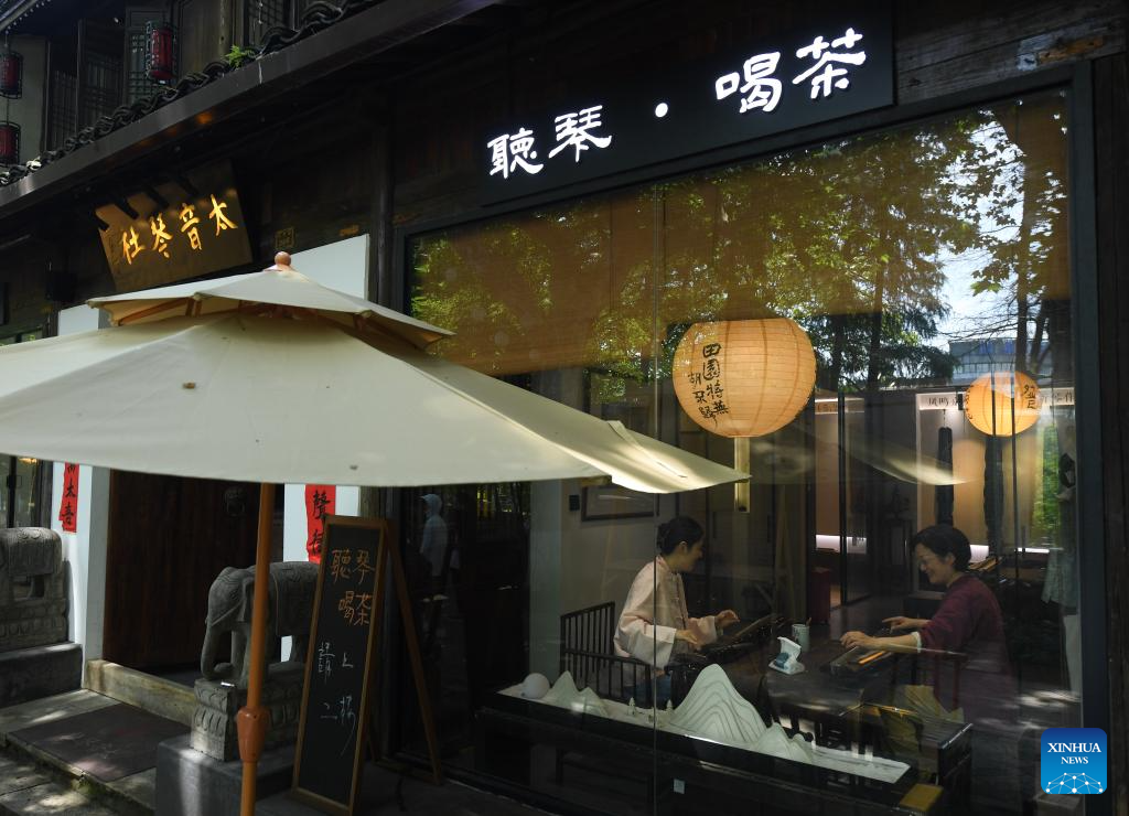 A teacher plays guqin, a plucked seven-string traditional Chinese musical instrument, with her student at a studio in Dadou Street historical and cultural block along the Grand Canal in Hangzhou, east China's Zhejiang Province, June 12, 2024. (Xinhua/Weng Xinyang)