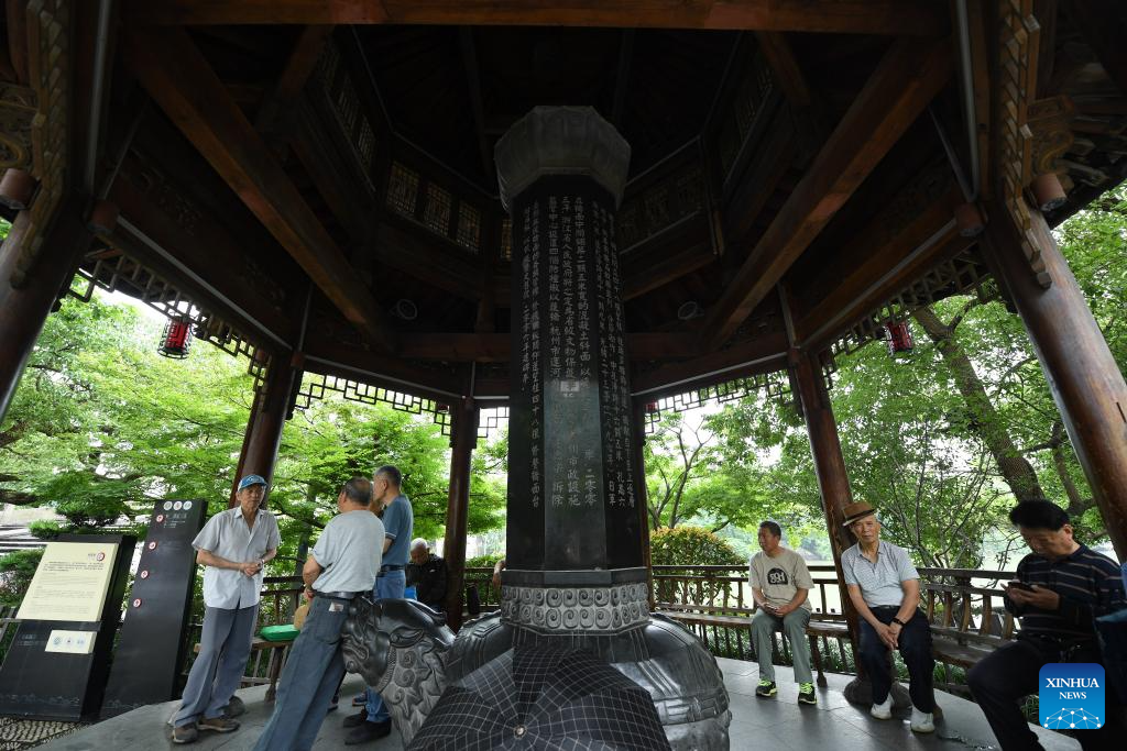 People rest at a pavilion beside the Gongchen Bridge over the Grand Canal in east China's Zhejiang Province, June 12, 2024. (Xinhua/Weng Xinyang)